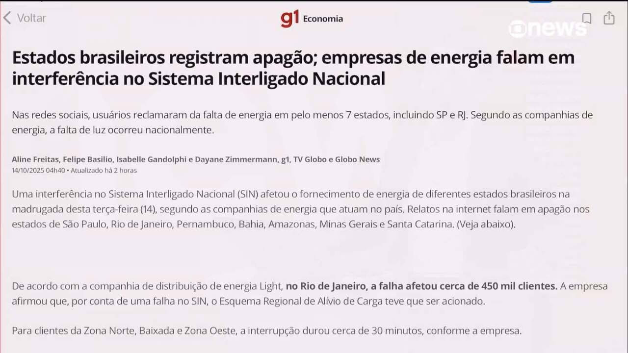 - ➡️Confira a nota na íntegra do Operador Nacional do Sistema Elétrico (ONS) O Operador Nacional do Sistema Elétrico (ONS) confirma que nesta terça-feira, 14 de outubro, às 0h32, houve uma ocorrência no Sistema Interligado Nacional (SIN) que provocou a interrupção de cerca de 10.