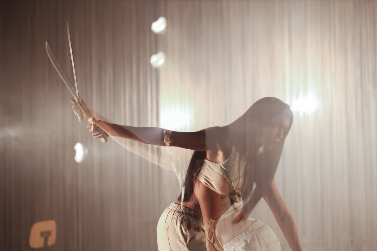 Em cena, a atriz alterna português e Ze’eng eté, canta lamentos ancestrais ensinados pela mãe e apresenta canções originais compBom ostas com Duda Rios, sob direção musical de Elísio Freitas.