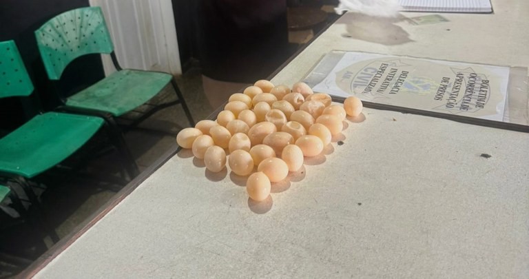 • De acordo com a Polícia Federal, uma mala despachada pela passageira foi identificada com 36 ovos de tracajá, espécie de tartaruga amazônica protegida pela legislação ambiental.